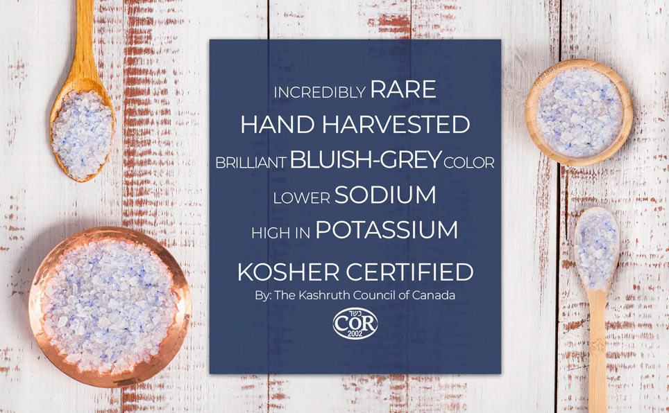 The Nutritious Blue Choice! Blue salt, hand-harvested from ancient dried seas, is considered one of the rarest salts in the world. This mineral-rich alternative to table salt is high in potassium and lower in sodium. With a uniquely bold taste and a bluish-grey color, it is a popular choice to elevate dishes or to be used as a garnish.